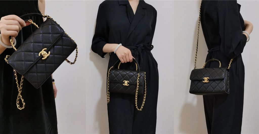 This bag has a handle + long leather through chain. The handle has a reinforced design, that is, the metal skeleton inside; This little Logo on the handle is my favorite part, a little careful and playful feeling,.Long chain, the chain of this bag is really the kind of Chanel chain is relatively short. Because the general chanel bag chain will be a little bit long, but this bag’s length is just right.