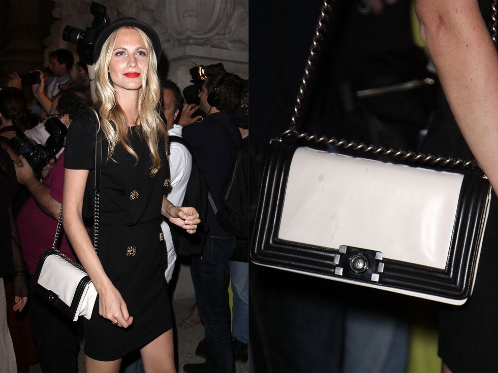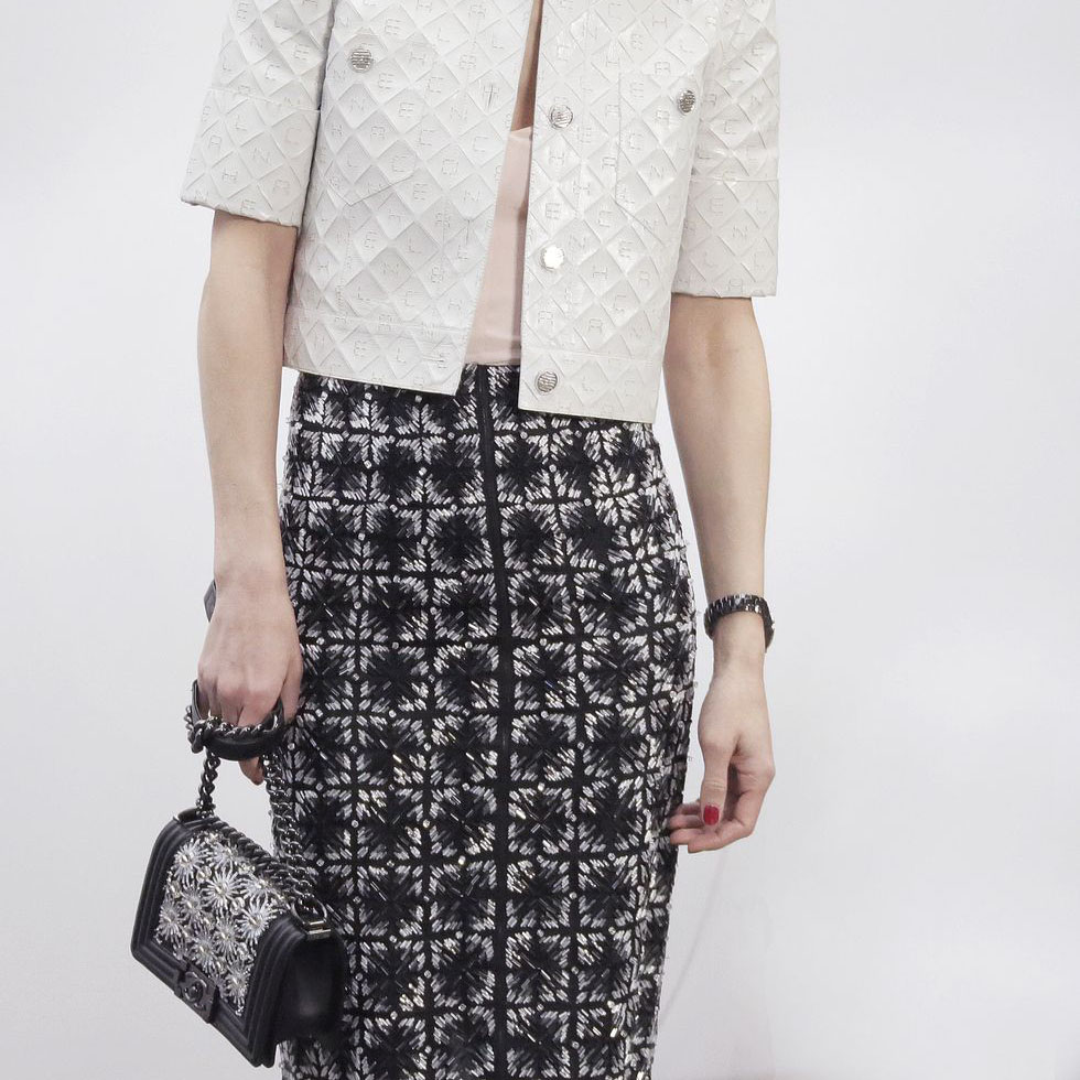 Poppy Delevingne was the first to showcase the classic black and white color scheme with distinct linear blocks when Boy CHANEL made its debut in the Fall/Winter 2011 haute couture show.